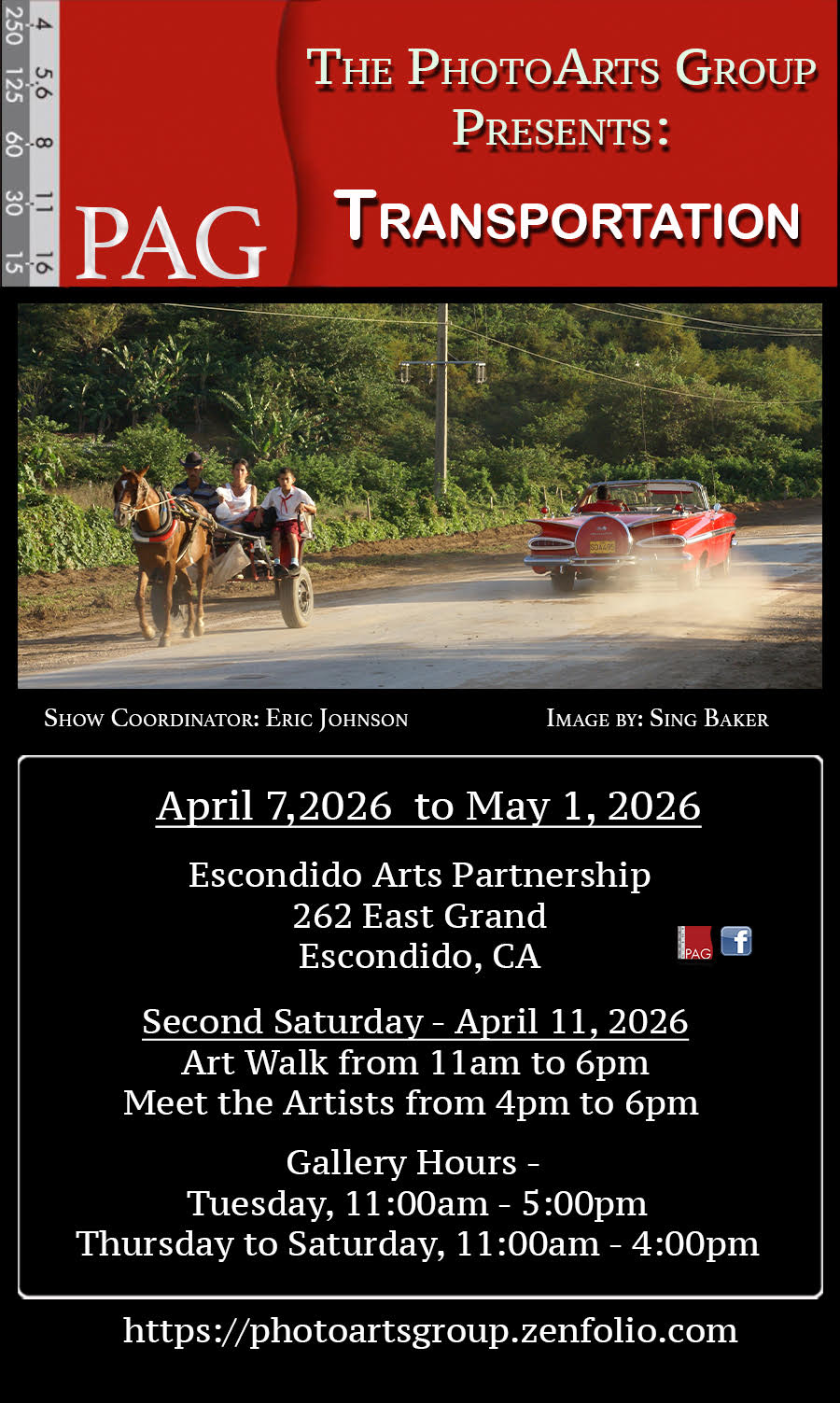 The PhotoArts Group (PAG) has made a name for itself in the County’s art scene since 2003 when it was created by a handful of professional and amateur photographers. Formed under the umbrella of the Escondido Arts Partnership, the artists early focus was to promote, display, and refine their work. While this is still their focal point, the Group’s interests have expanded to include mentoring aspiring artists, networking with other photography groups, and promoting photographic arts in San Diego County communities.